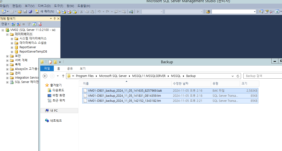 시간 단축을 위하여 트렌젝션 로그 백업도 2~3분 주기로 즉시 실행