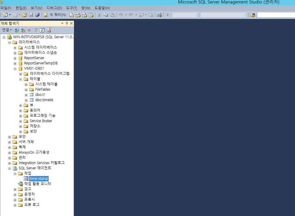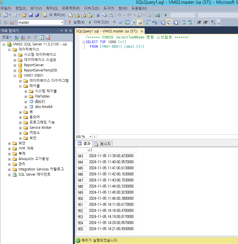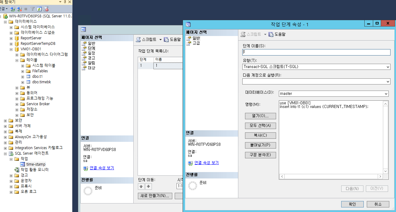 1. VM01 의 SSMS 에 개체 탐색기에서 VM01-DB01 DB 생성 및 1분 마다 날짜시간이 찍히는 스케줄 등록