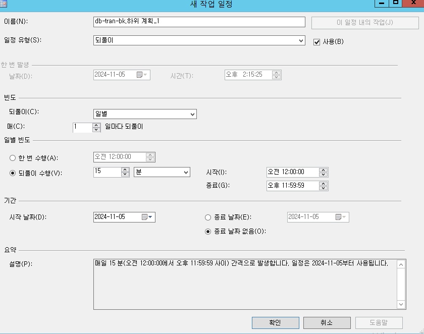 스케줄은 15분 마다 트렌젝션 로그 백업