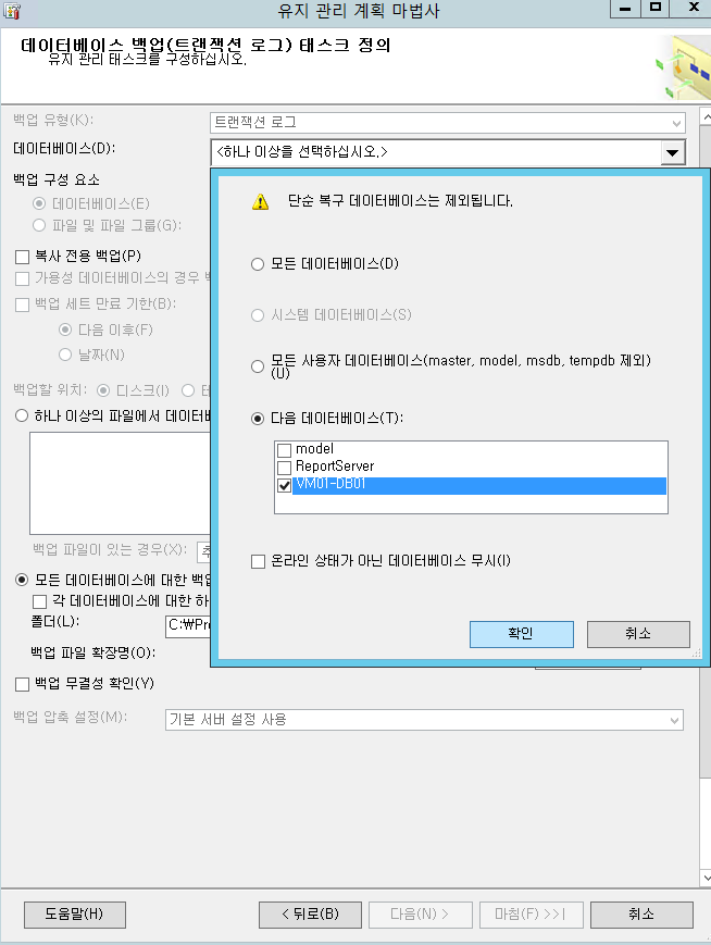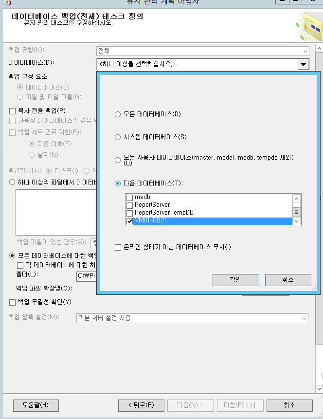 백업할 DB (VM01-DB01) 을 선택 후 확인, 그리고 다음, 다음, 마침.