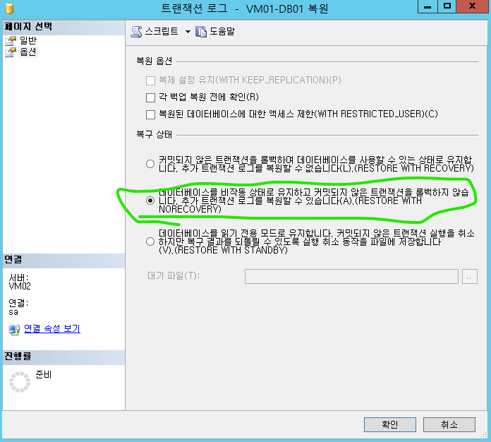 복원할 나머지 .trn 파일이 있으니 옵션 -> restore with norecovery 선택 -> 확인