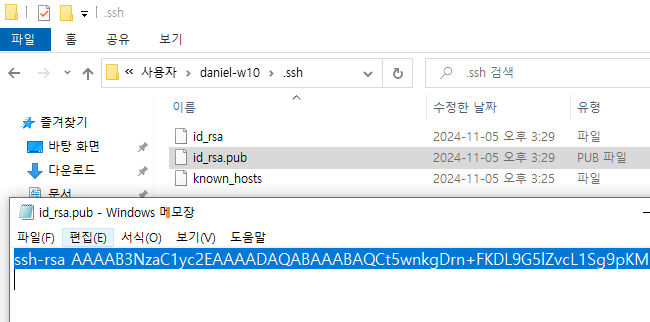 C:\Users\username\.ssh 폴더 안에 id_rsa.pub 내부 암호화 키 텍스트 복사