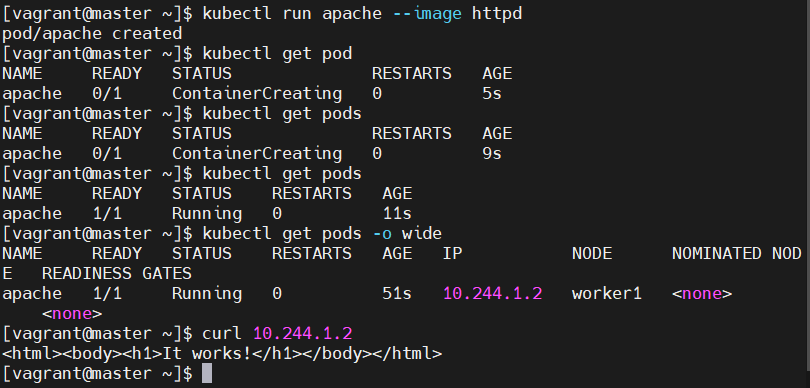 $ vagrant@minikube:~$ kubectl run apache --image=httpd:2.4