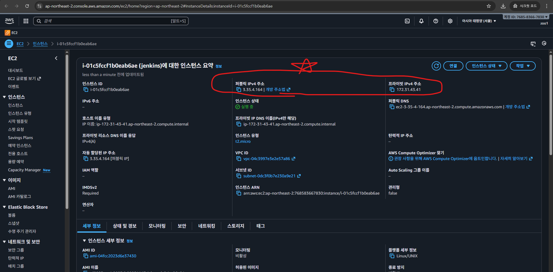 탄력적 IP 생성 후 인스턴스 연결 필요